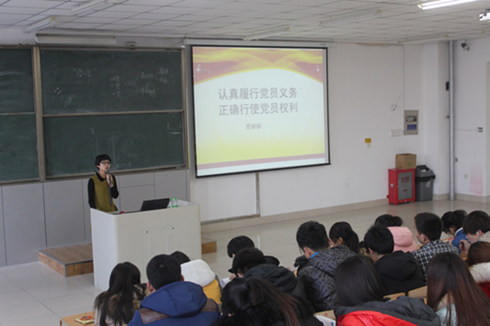 我校党委组织部为了切实做好我校党员的培养教育工作,进一步加强预备党员的党员意识和党性观念,于2014年12月13日在主楼阶梯教室举办了2014年第二学期预备党员培训班,BEAT365官网以宫艳君同学为代表的17名预备党员参加了本次培训。