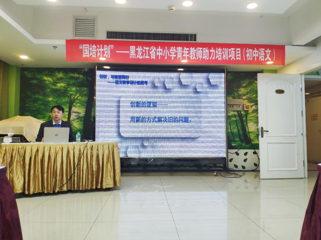 11月29日上午为进一步加强学员老师的专业素养、学科知识、教学设计与反思、教学技能等。特邀请大庆市第三十六中学副校长范亚超老师为大家作一次专题讲座“创新,与智慧同行——浅谈初中语文教学设计”。范老师从教以来一直工作在教学一线,先后担任过班主任、备课组长、教研组长、年级主任、教务主任等职。被中国基础教学学会评为“全国优秀辅导教师”,获得 “黑龙江省模范教师”“大庆市优秀教师” “大庆市骨干教师” “大庆市教学能手” “大庆市优秀德育工作者” “让胡路区教育领军人才”多项荣誉称号,曾出版个人教学专著《作文如是》,优质课《沁园春·雪》获国家级一等奖,承担课题研究多次获奖,论文多发表于各类刊物。